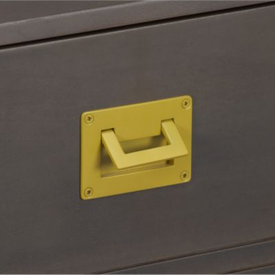 The overall shape of the piece and the hardware definitely look campaign-inspired to me (though the website talks about library cabinets as the inspiration), and I like the idea of painting the hardware an unexpected color, and keeping the wood-grain finish as a contrast. In the girls room, I could do chartreuse, bright pink, or a sort of aqua blue on the hardware.