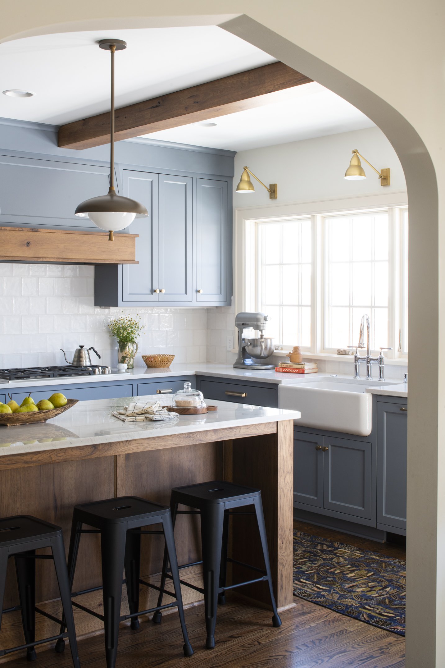 In a kitchen, chairs and stool can be another opportunity to tie in your metal finishes—after all, a metal stool is durable and easily cleaned. In this kitchen, we used the mixed-finish fixture technique with our island pendants, then repeated the brass on the sconces and knobs, and brought the black to the counter stools. (Note that the silver plumbing rule also plays out here—a chrome faucet feels right at home with the stainless steel coffee maker and mixer, even though our large appliances are all paneled.)