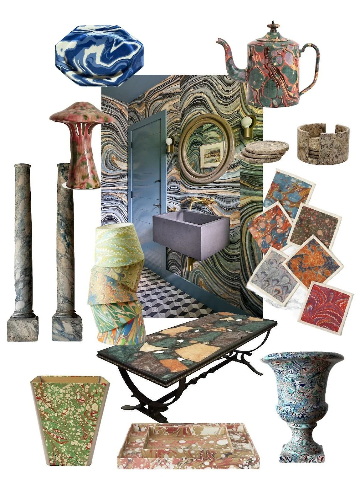 We have used marbled wallpaper, lampshades, books, trays, trash cans—you name it! We also like actual marble and I threw in a few pieces for good measure.