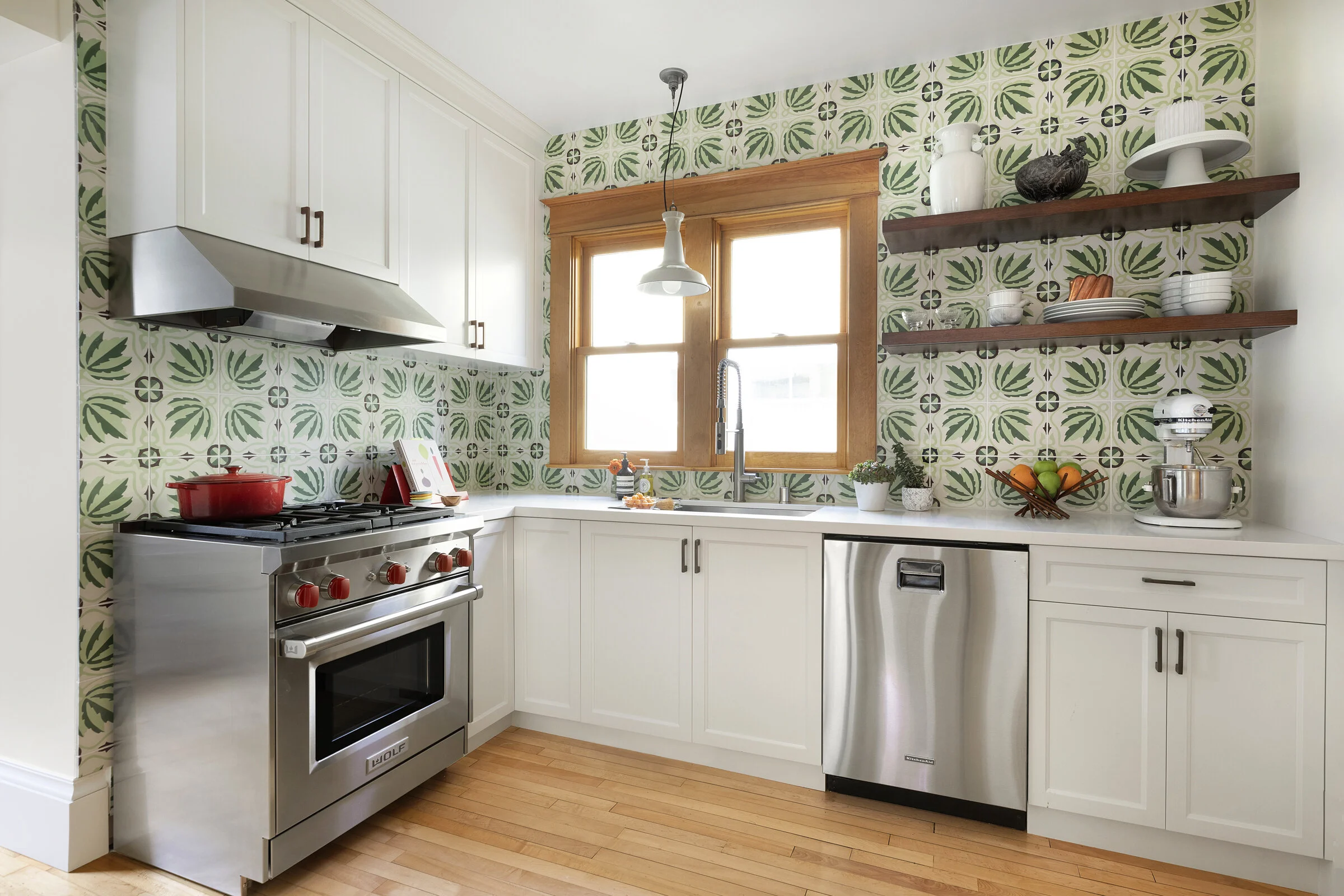 Lisa’s house was built in 1911, before home refrigeration. Our main job was to get the refrigerator out of the back hall! The mechanicals stayed put and we kept one of two original built-ins, but we maxed out the rest of the kitchen for storage and opened the connection to the back hall to capture that space. Lisa prefers strong color on a white field, so we used cement tiles to create happy drama in the kitchen. The bathroom gained a foot to accommodate a standard tub and pony wall, and we shrunk a large window for privacy. Jumbo penny tile and a vintage danish dresser-turned vanity dial up the personality!