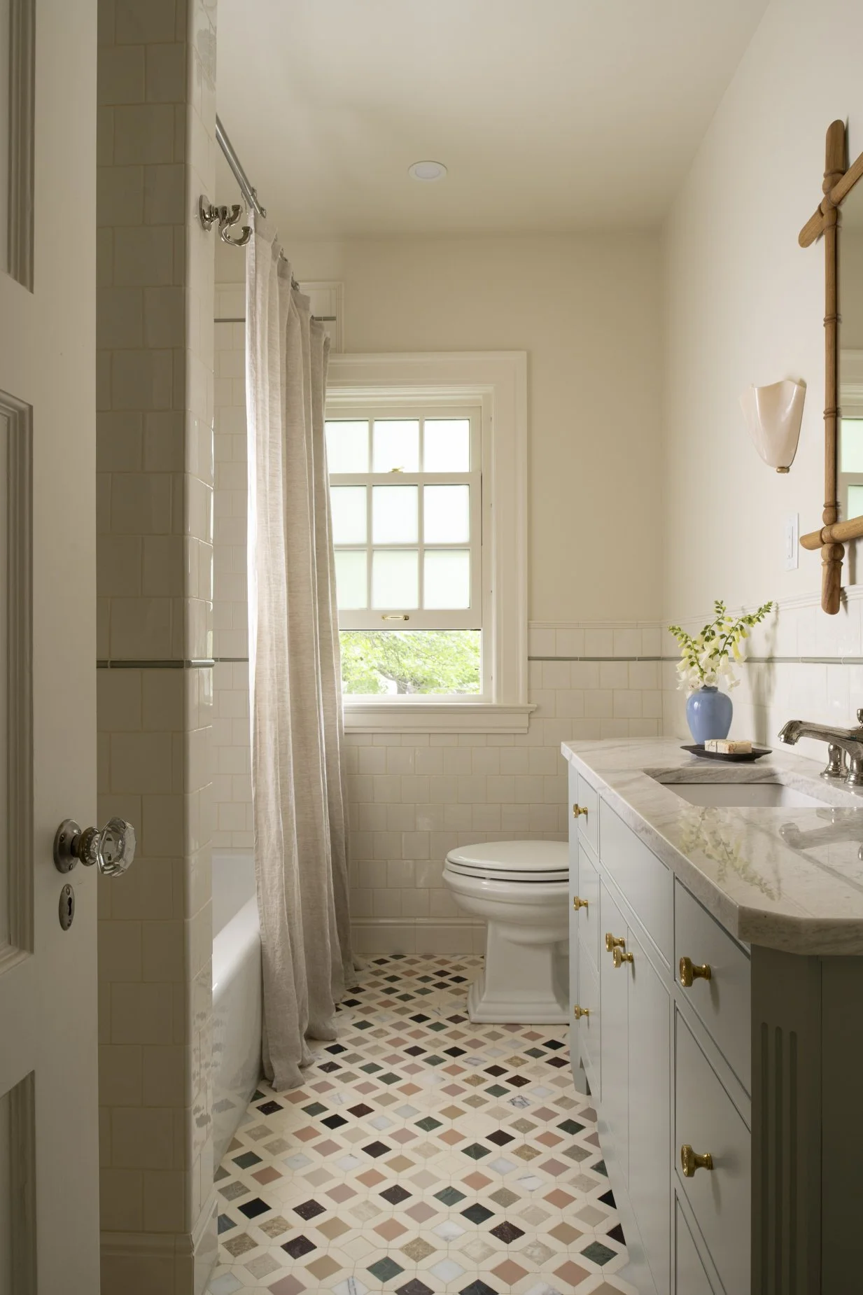 After thirty years in this brick colonial home, it was time for a refresh. And ultimately, this idea of breathing fresh air was our guiding principle. We repurposed much of the clients’ furniture, but simplified formal frames, removed skirts, lightened up fabrics. Where once each room had a strong wall color, the home is now washed in shades of off-white. We breathed new function in while we were at it, with a destination games table brining new life to the living room, a reworking of a bathroom that make room for two, and a new customized baking center to meet all of our client’s baking dreams.