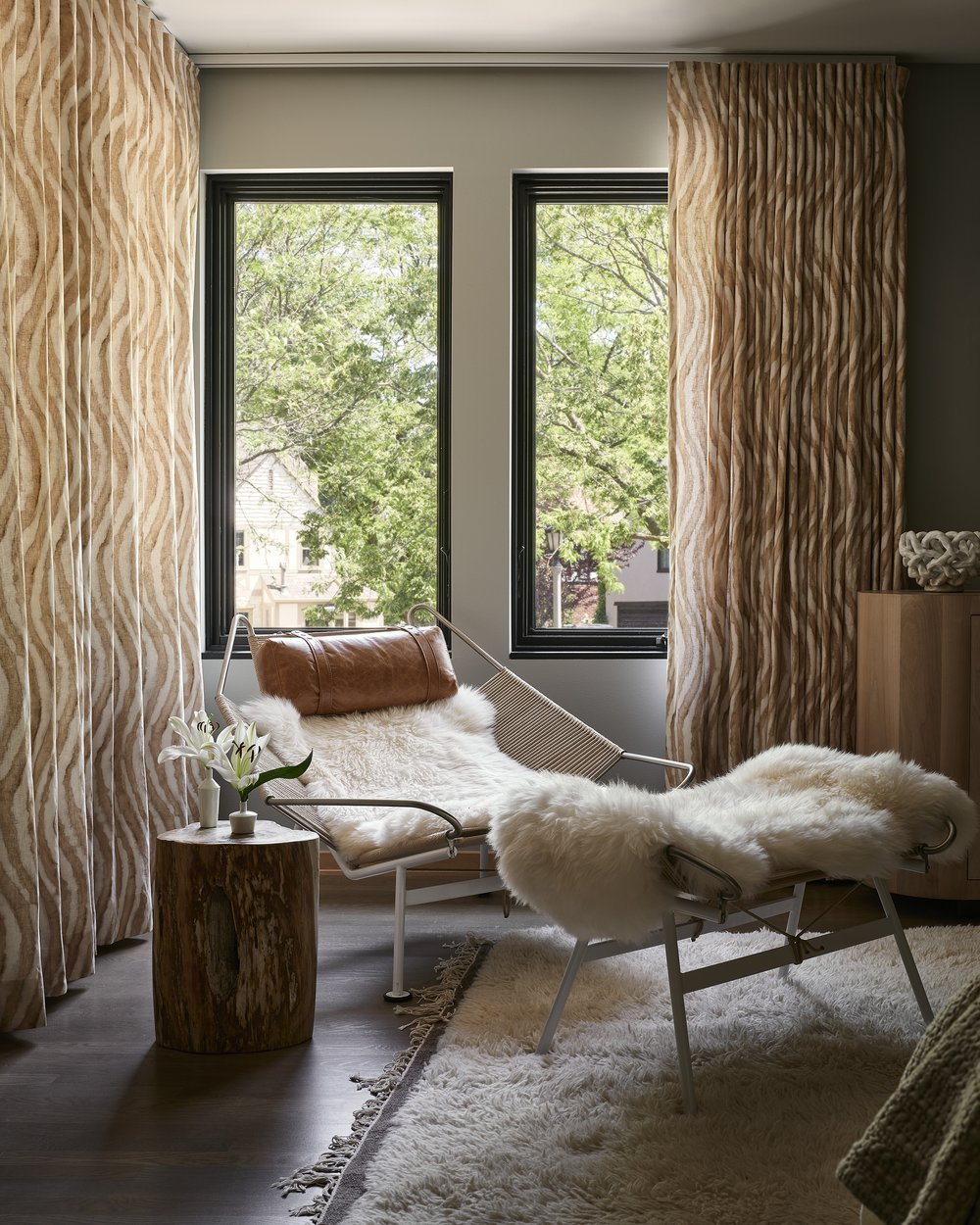 Roy and Sara purchased this second home as a test in the early days of the Covid pandemic to see if they could move their lives to her hometown of Milwaukee. The creative brief was to give a spec house interest and personality without completely starting over. We furnished it quickly, with lots of vintage and carefully selected modern retail pieces. Later we tackled a light renovation of the kitchen and bathrooms, adding warmth through lighting, wallcoverings, and custom touches like the hand-made tile in the kitchen. Art by living artists, some with Covid themes, join graphic rugs and neutral, organic textiles to create a light, easy home.